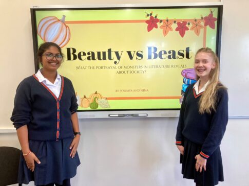 The second talk, Beauty and the Beast: Monsters in Literature and What They Reveal About Society, was delivered by Nina and Sowmya in Year 10. Their thought-provoking exploration of monstrous figures in literature examined how authors use these characters to reflect social fears, values, and prejudices.